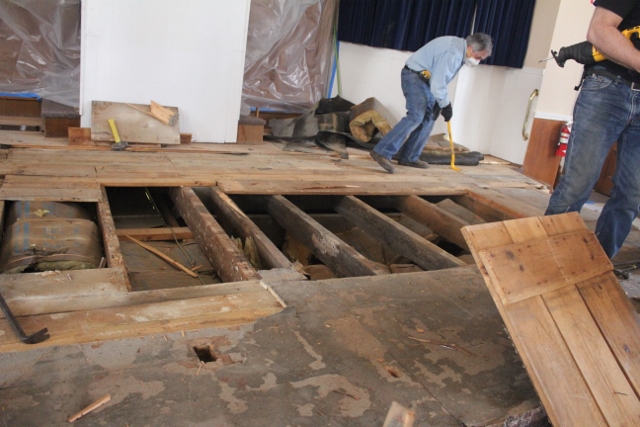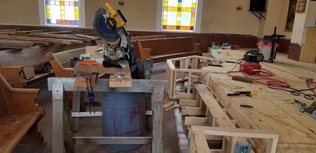 It was now possible to plan for more visual enhancements to the sanctuary. A sanctuary refurbishment committee was organized by the congregation. The first project was to update and enlarge the platform. After a planning period and architectural drawing of the proposed platform construction work began in early April of this year.