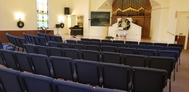 Once the work on the platform was well underway the church came together to make a decision on seating. After discussion of options and costs the church members voted to replace the 130-year-old pews with individual navy-blue pew chairs. Once the decision was made individuals donated toward their purchase. These chairs replaced the wooden pews which were placed in our sanctuary in 1888. The wooden pews have since been donated to the Seabee museum in North Kingston, RI.